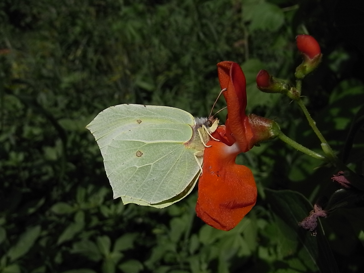 ce citron butinait les fleurs de haricot. les photos sont faites en continu manuel donc espacées, le temps de la mise au point. le papillon a donc pris son temps pour arriver, et ensuite, durant un moment, lécher le nectar en enfonçant sa trompe de plus en plus loin dans la fleur...