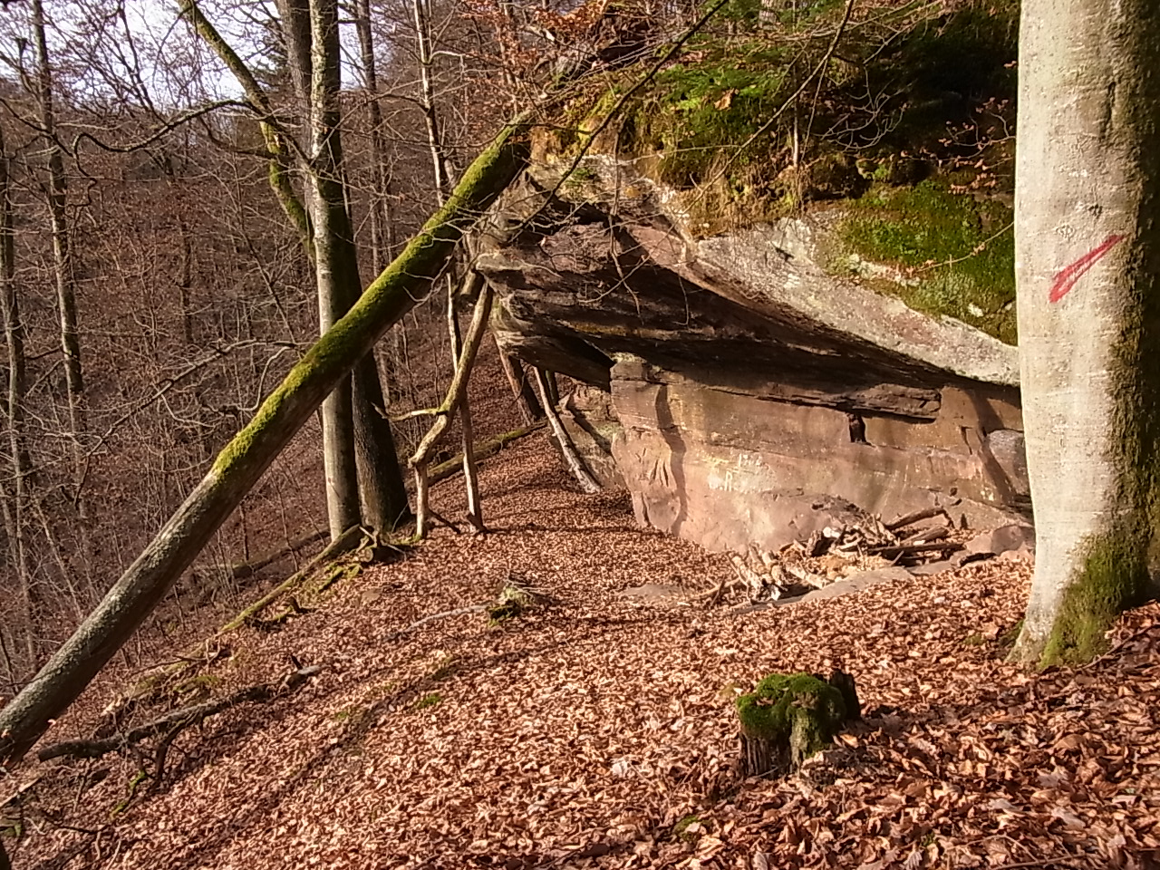 les feuilles sont tombées, ce qui fait apparaître les gros rochers de grès rose vosgien