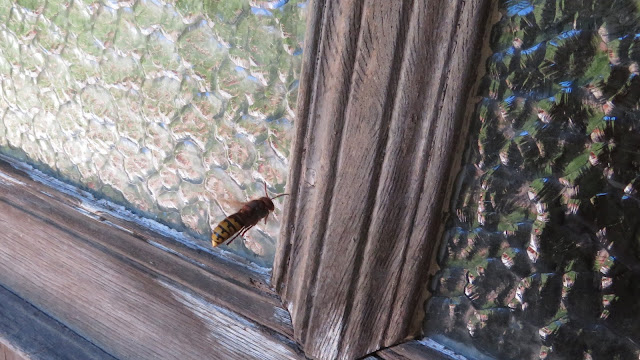 les frelons se font rares... cette grosse frelonne inspectait la porte d'entrée durant un moment...